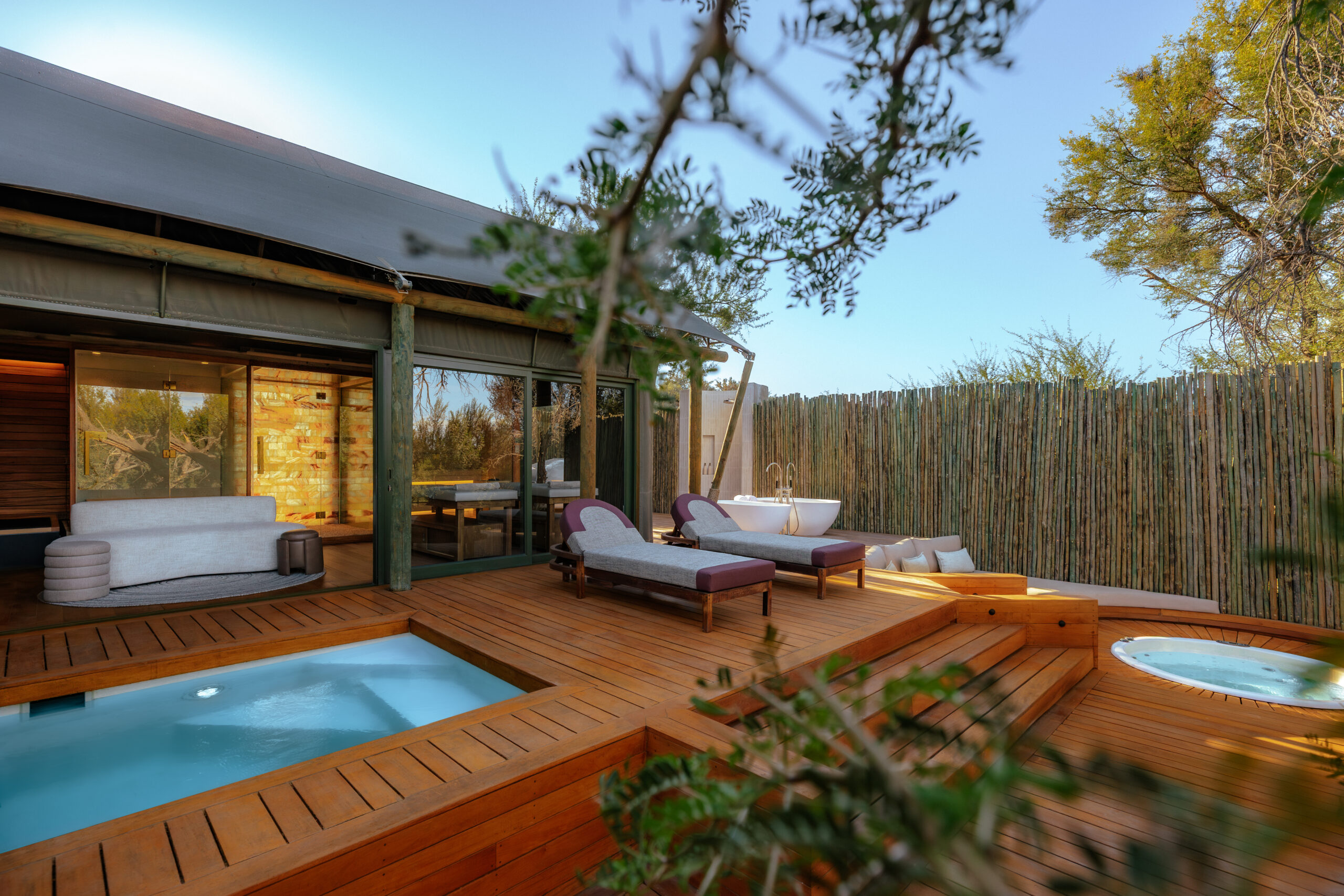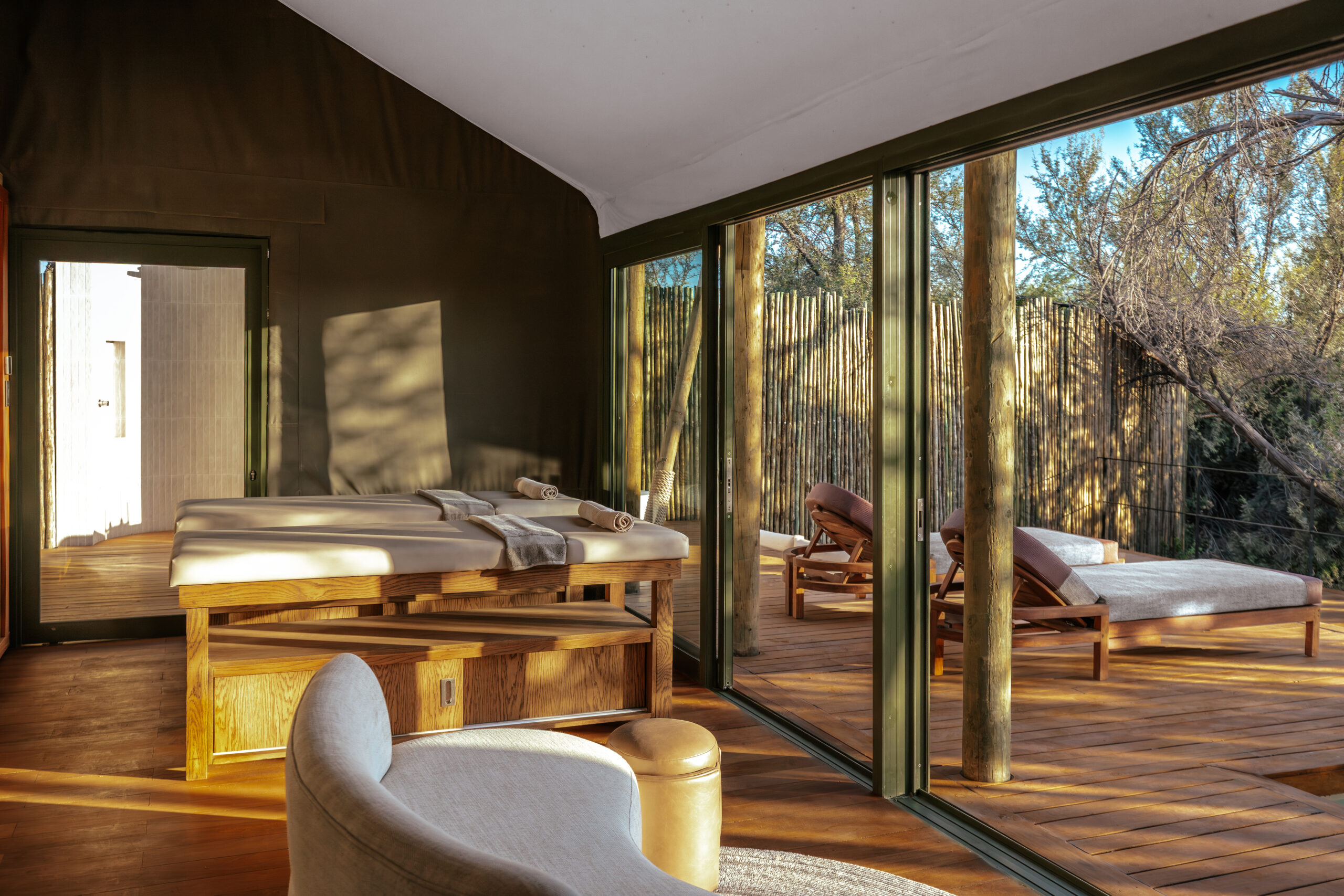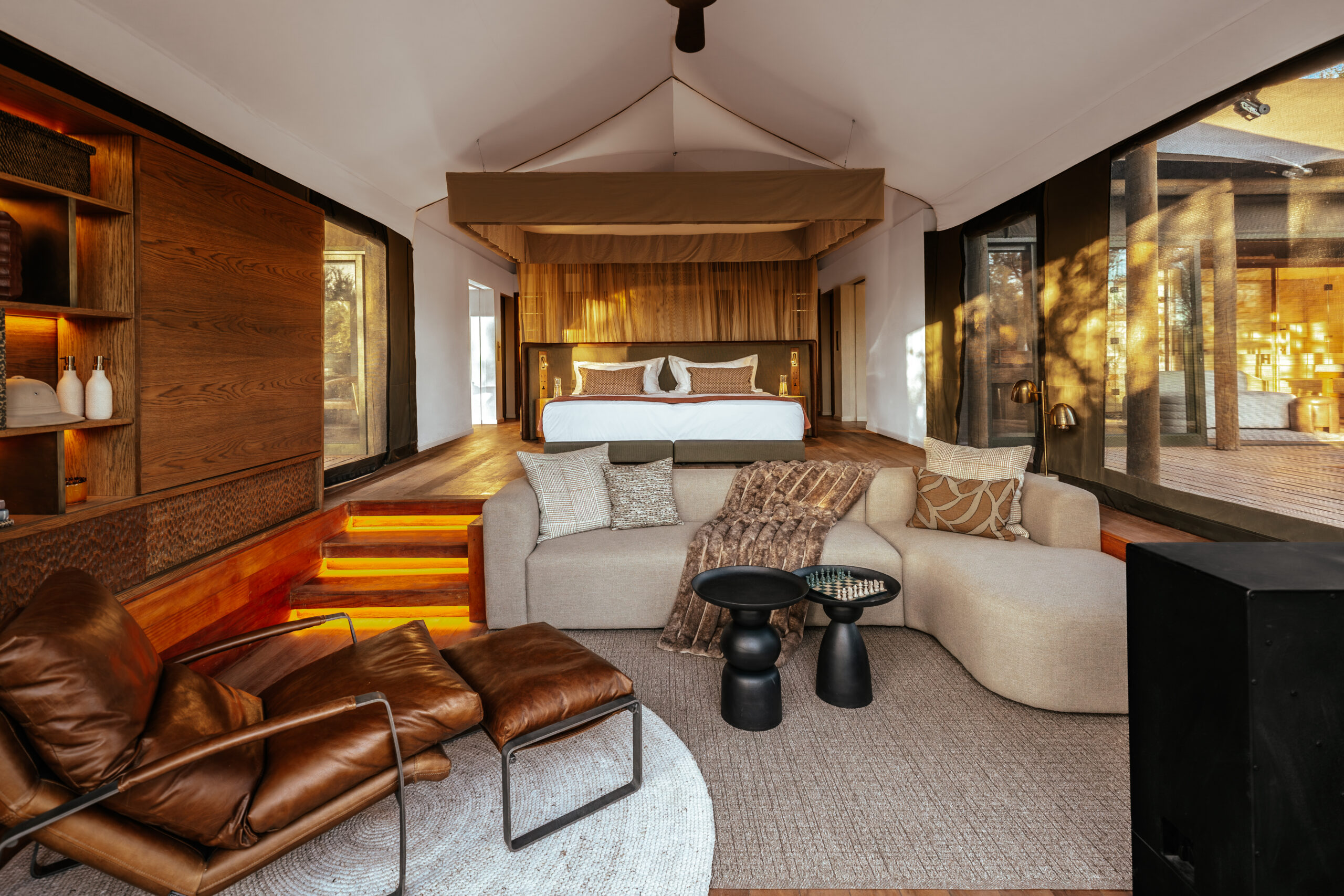 The main lodge and tented spa suites are gently raised above the earth, allowing wildlife to wander unhindered beneath open skies and along Acacia Karoo-lined riverbeds. Elephant pause at the water’s edge to drink from private pools, giraffe browse quietly from treetops, and antelope settle in the dappled shade between the tents. It is a rare harmony - open, natural and entirely secure.