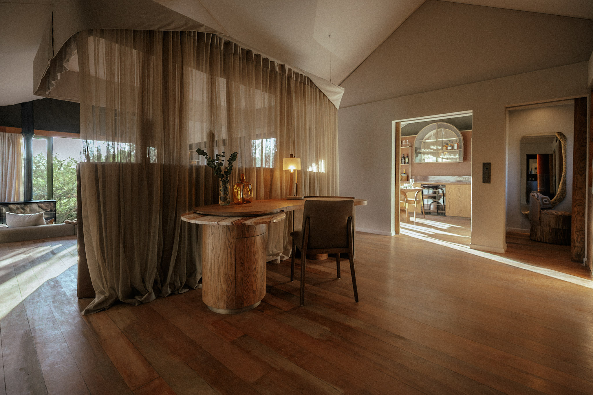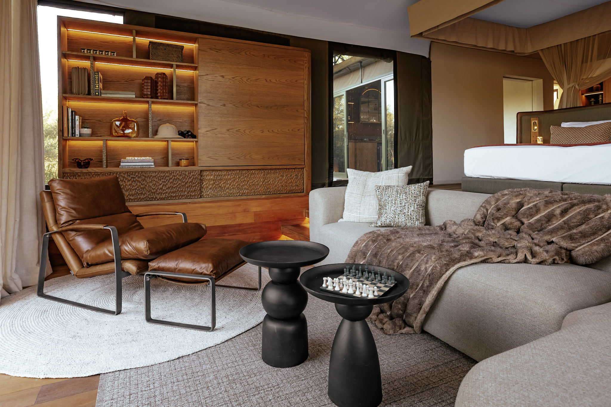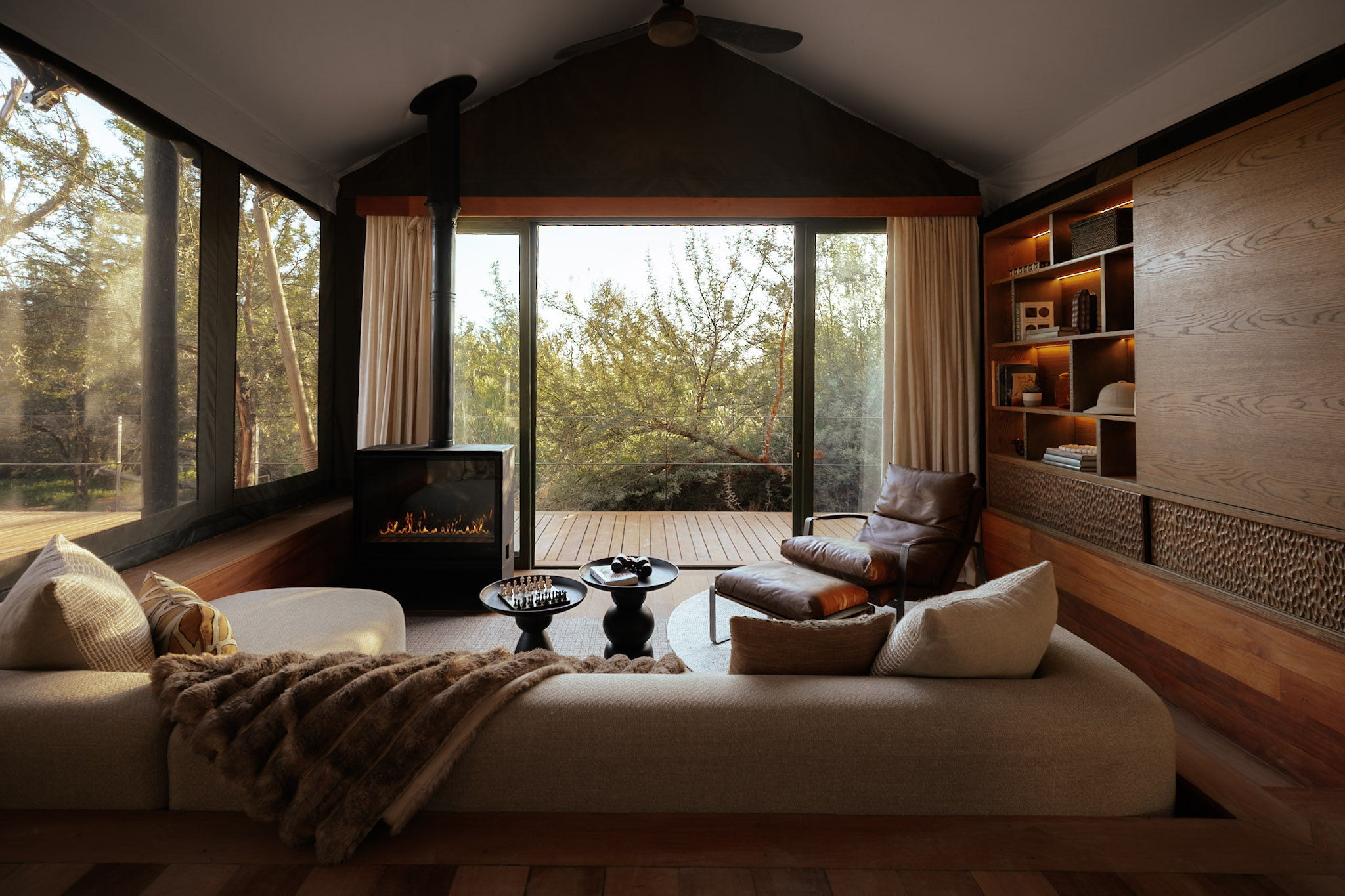 The main lodge and tented spa suites are gently raised above the earth, allowing wildlife to wander unhindered beneath open skies and along Acacia Karoo-lined riverbeds. Elephant pause at the water’s edge to drink from private pools, giraffe browse quietly from treetops, and antelope settle in the dappled shade between the tents. It is a rare harmony - open, natural and entirely secure.