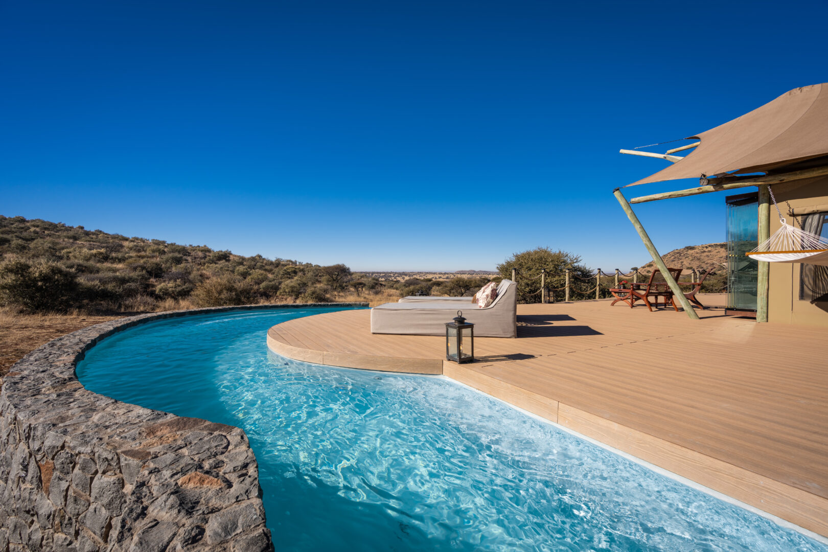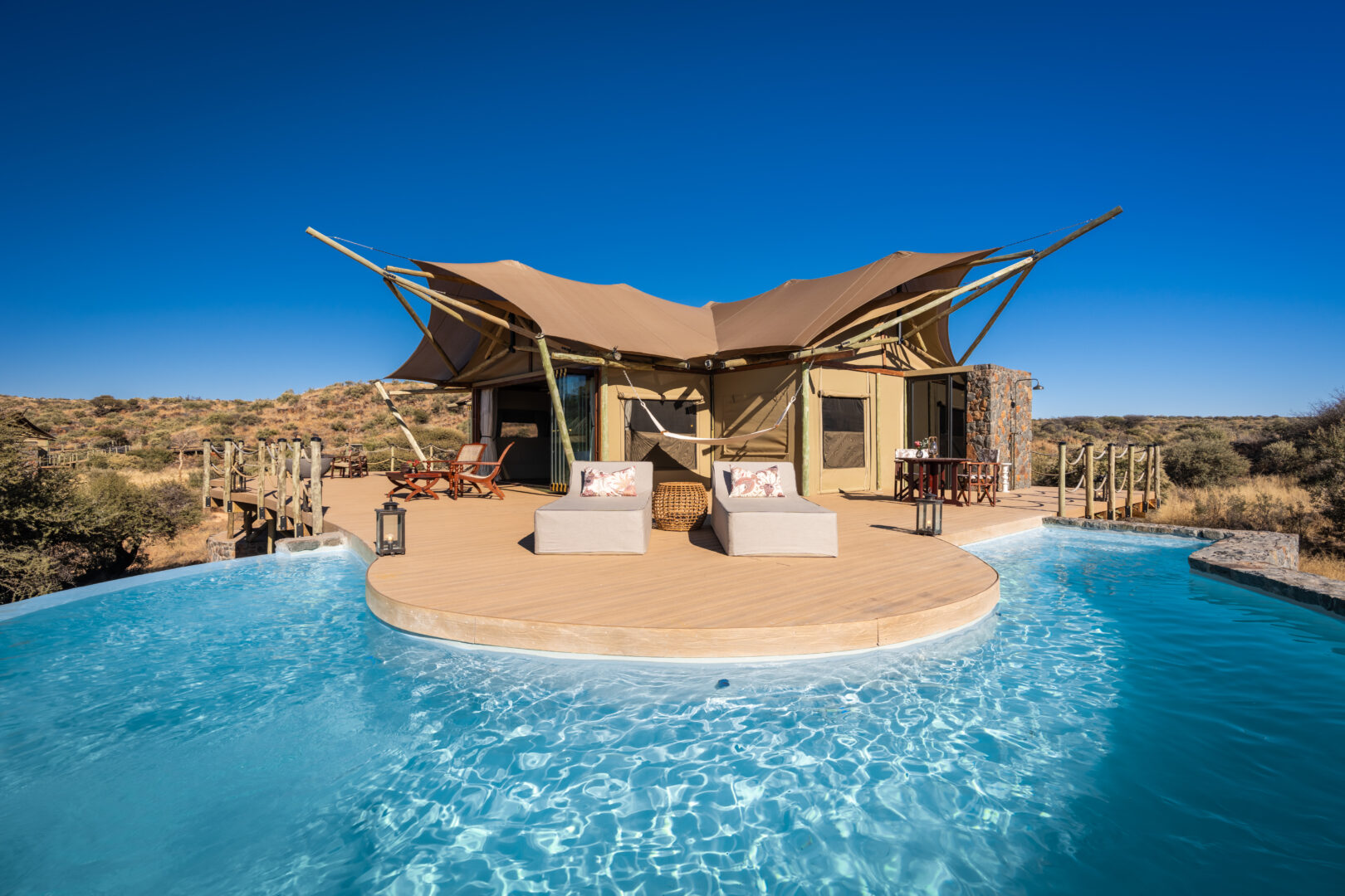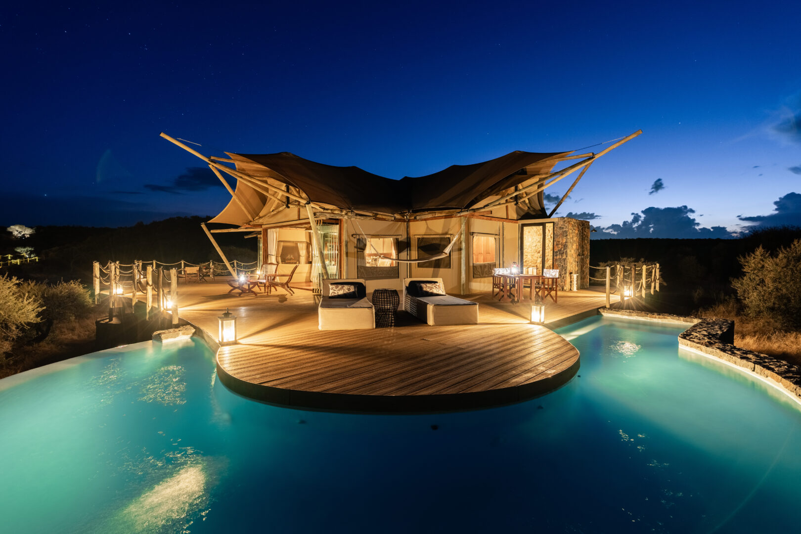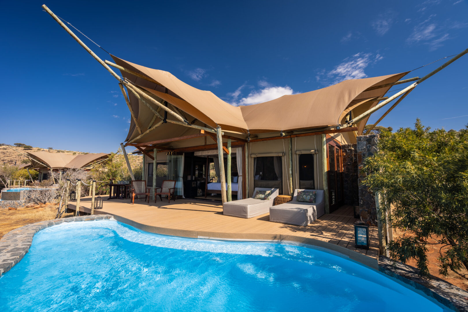 Each suite includes a private plunge pool, indoor and outdoor showers, a fireplace and sweeping views over the savannah. The Diamond Suite elevates this even further with its own safari vehicle, larger pool and panoramic deck.