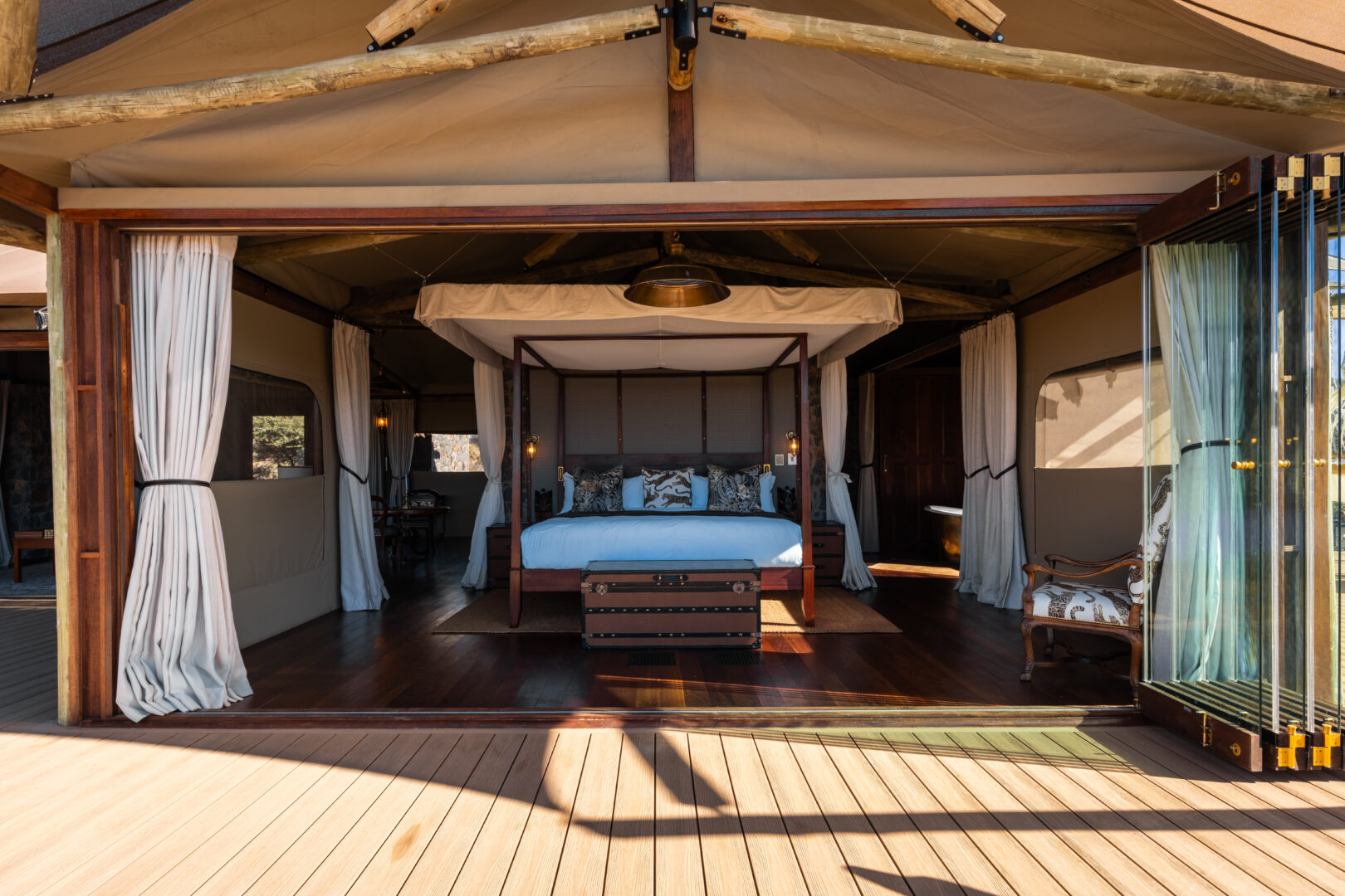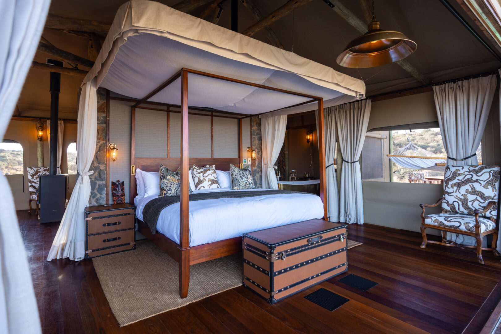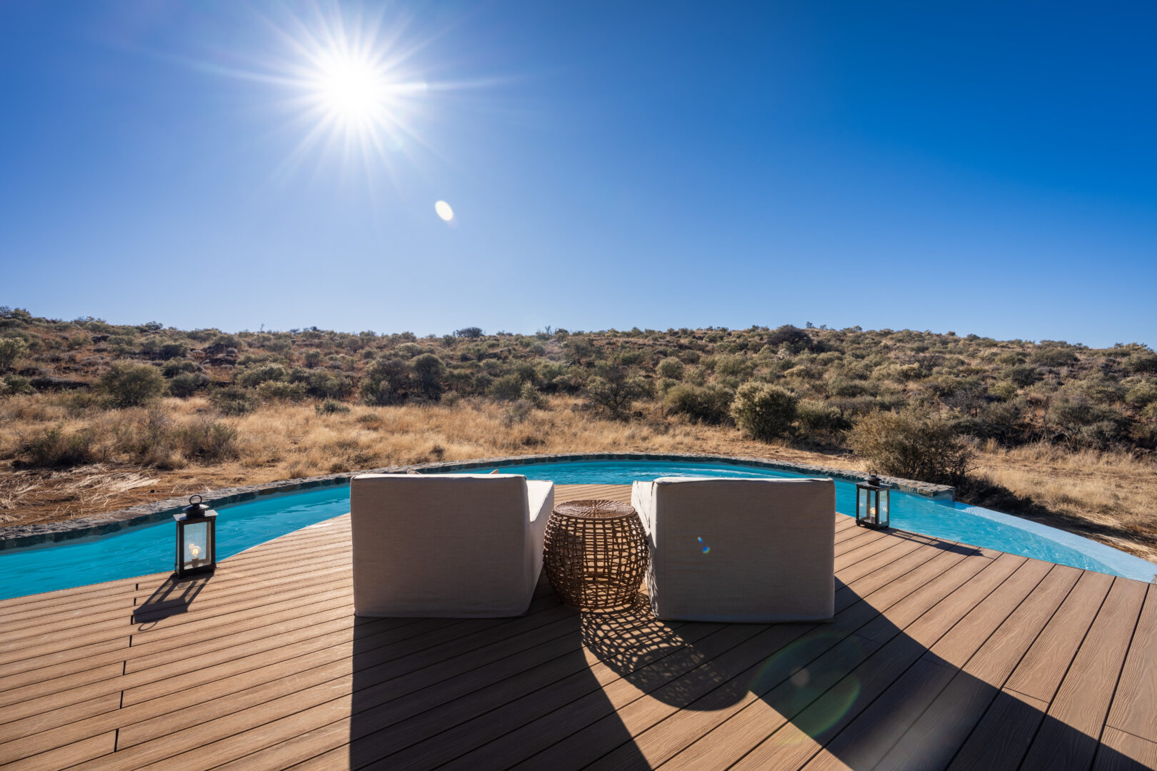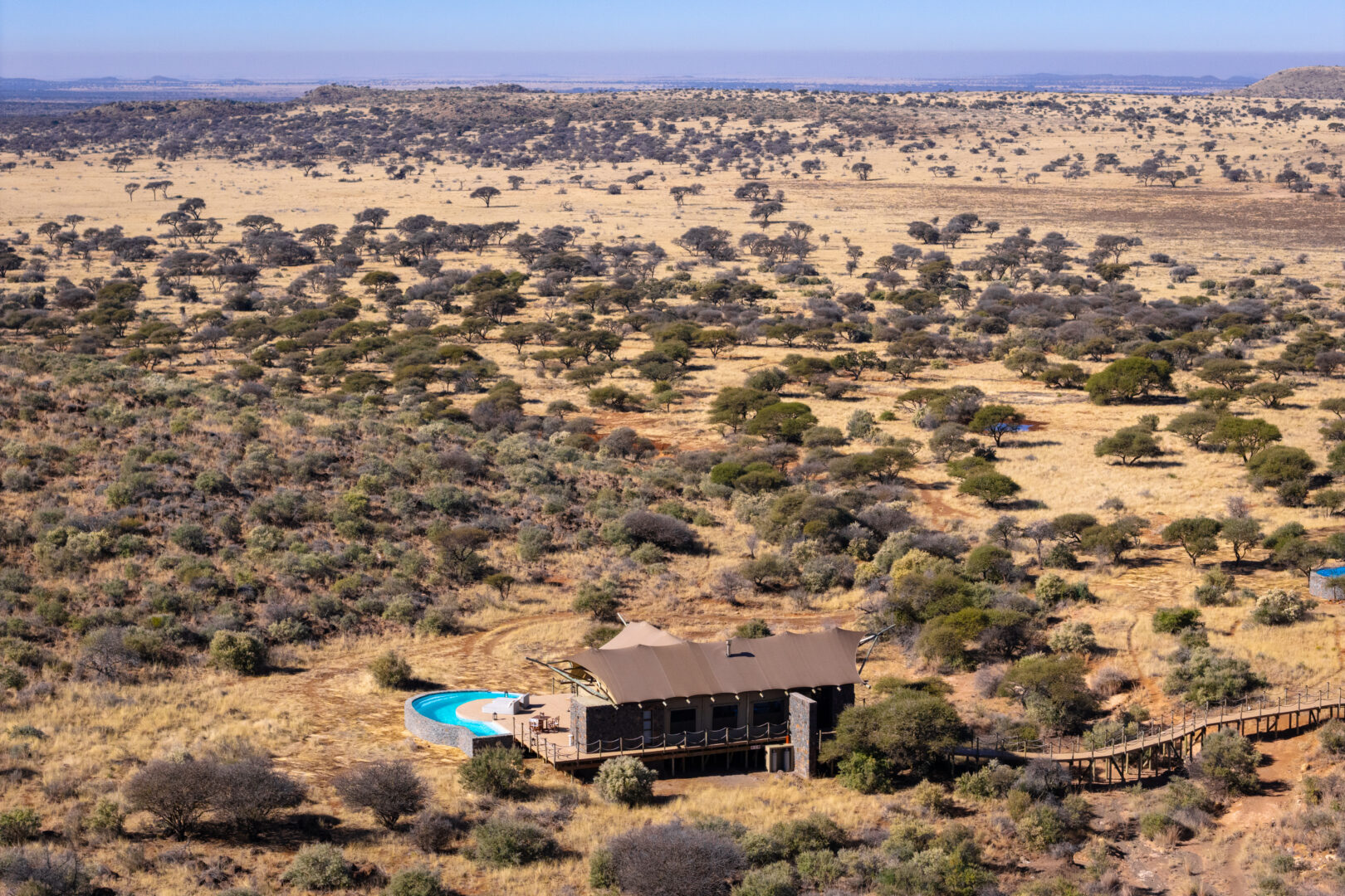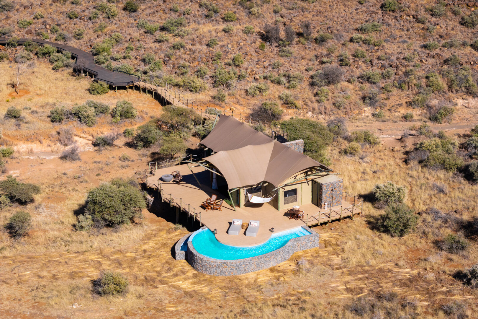 Each suite includes a private plunge pool, indoor and outdoor showers, a fireplace and sweeping views over the savannah. The Diamond Suite elevates this even further with its own safari vehicle, larger pool and panoramic deck.