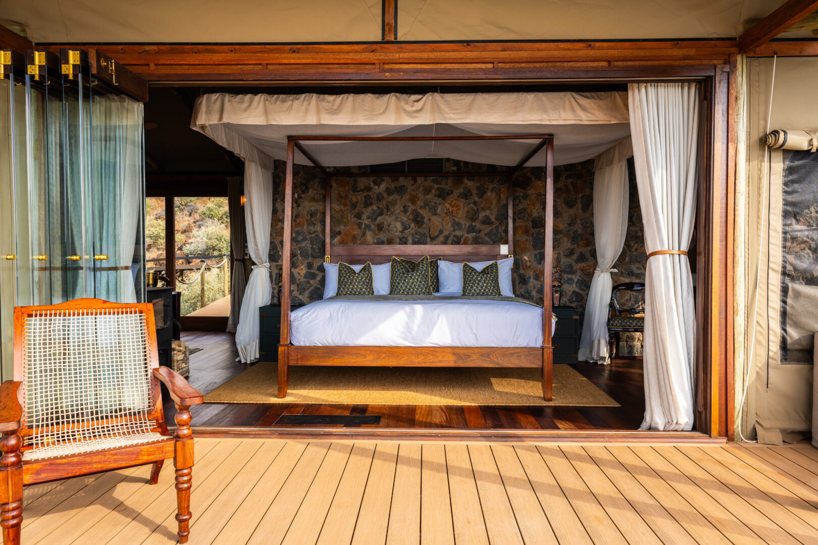 Every stay includes twice-daily game drives led by expert rangers, with exceptional wildlife viewing from rhino and cheetah to rare nocturnal species. Guests can enhance their stay with helicopter safaris, horseback riding, conservation encounters, shooting range sessions and diamond mine visits.