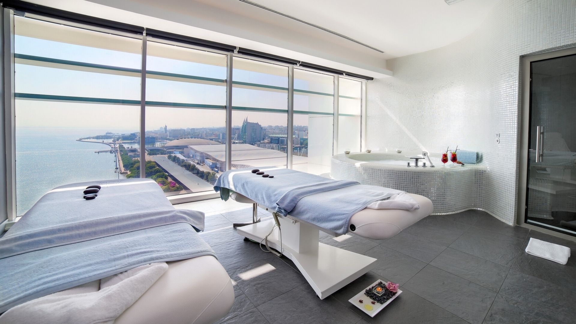 On the upper floor, SAYANNA Wellness & Spa offers treatment rooms, an indoor pool, a sauna, and a fitness centre, all with sweeping views over the river and the city. Crowning the hotel at over 100 metres high is the Vasco da Gama Tower | Babylon 360º — one of Lisbon’s highest observation decks, offering spectacular 360º views of the city and the river.