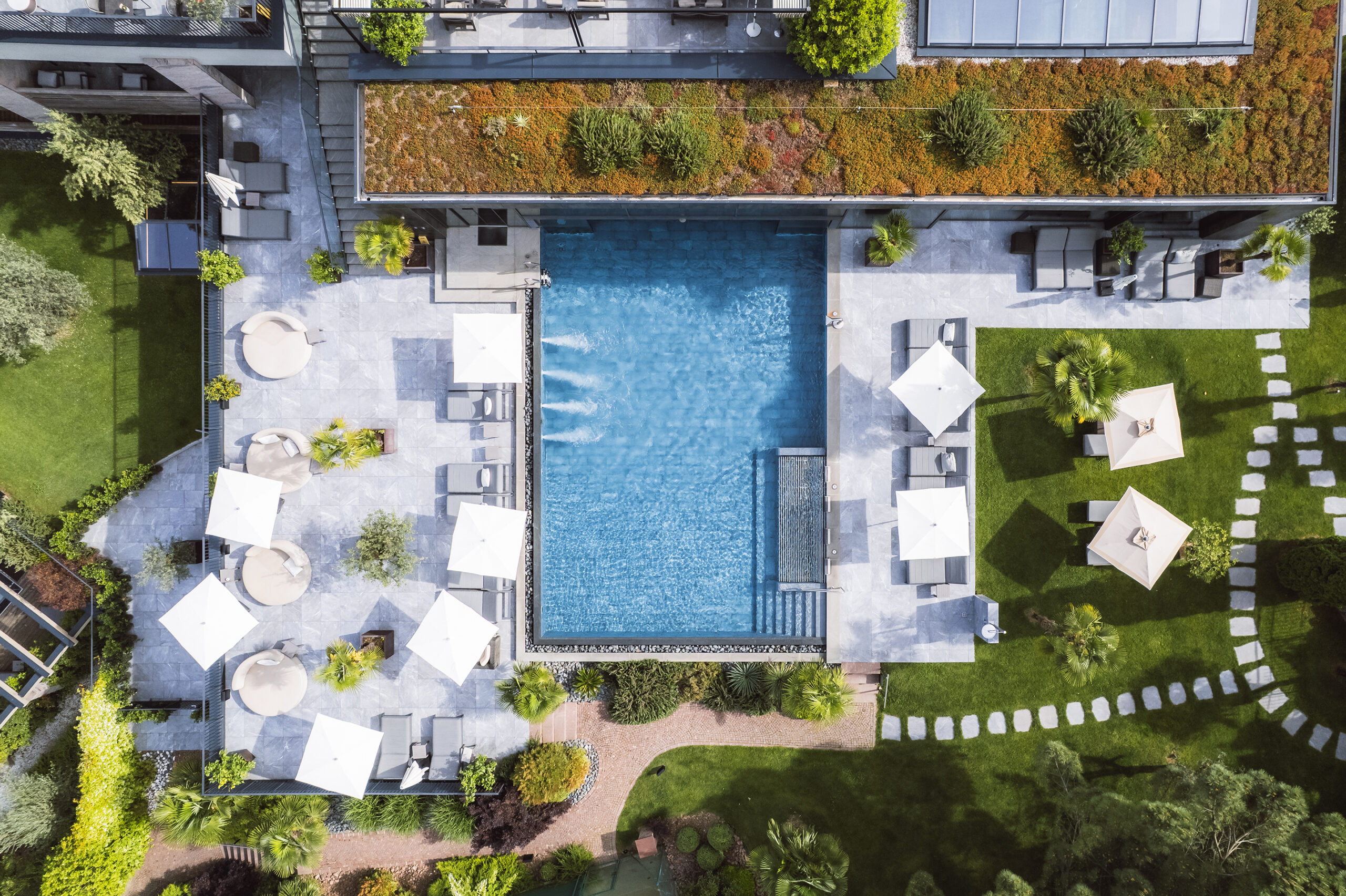 Six turquoise pools, including the 60-metre suite pool, the indoor-outdoor infinity pool and the outdoor pool with sandy beach, create a truly unique wellness experience.